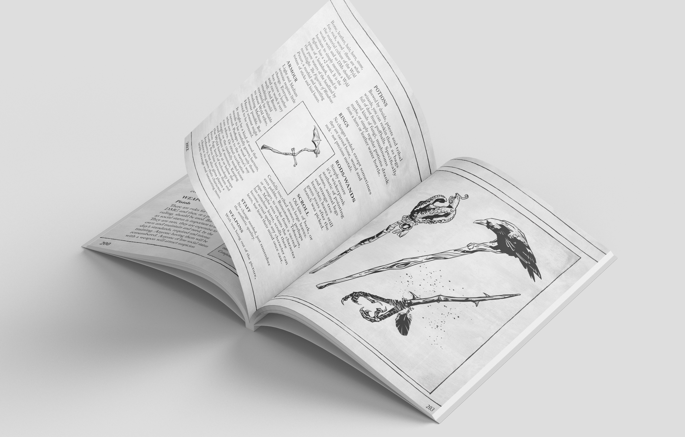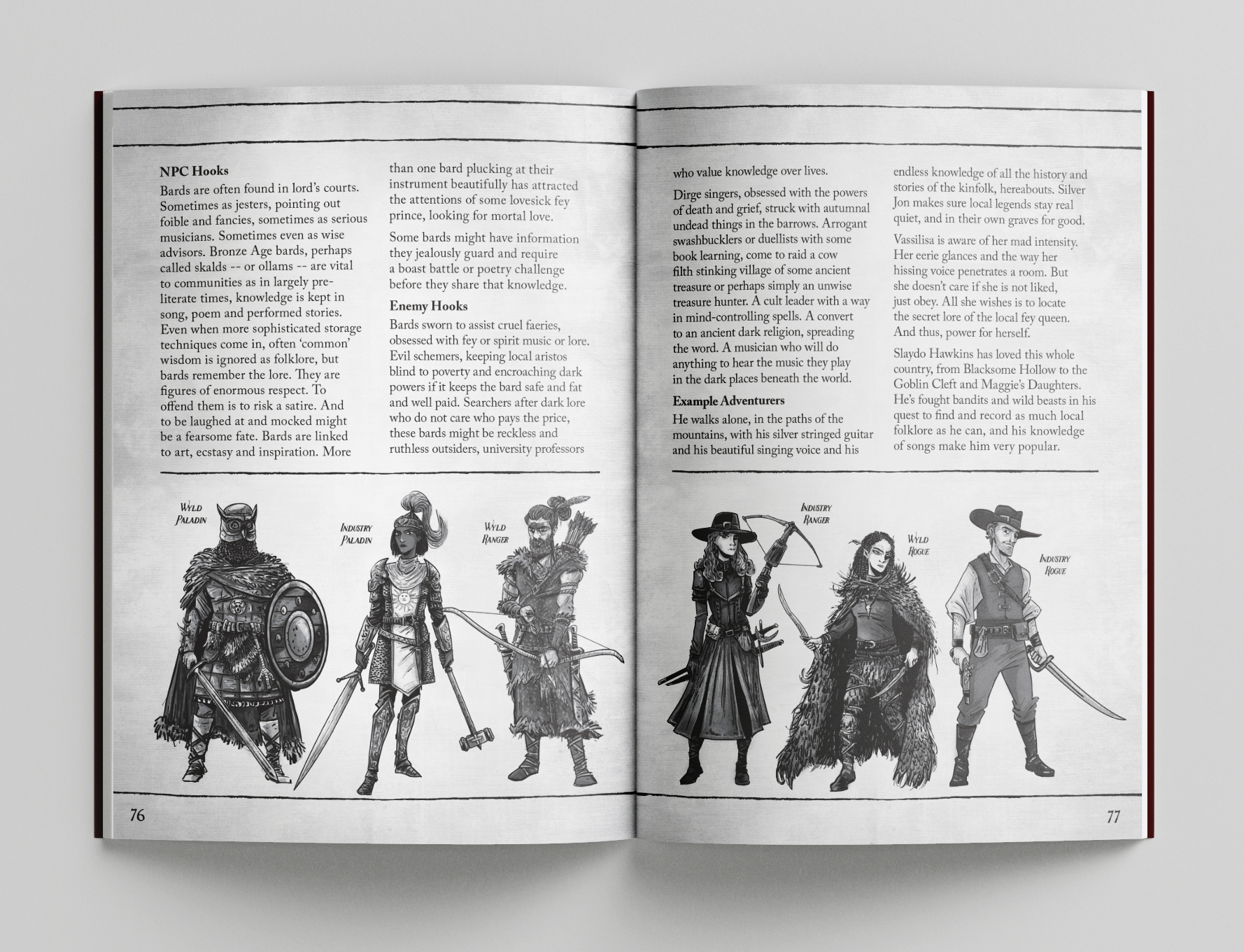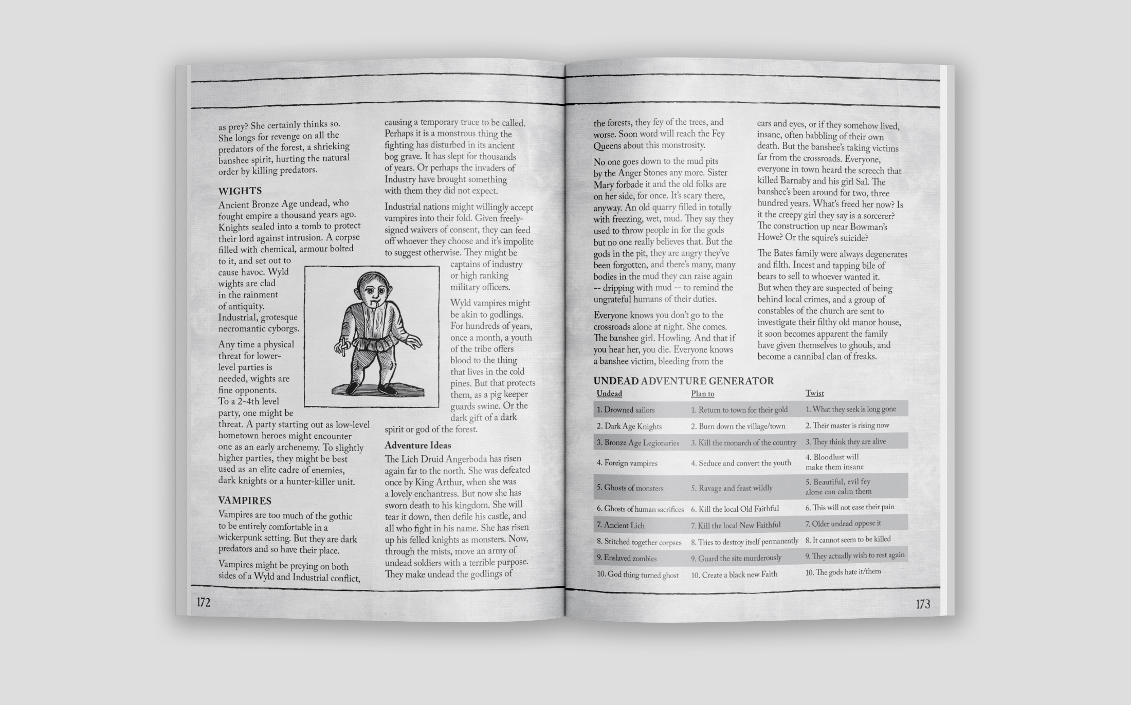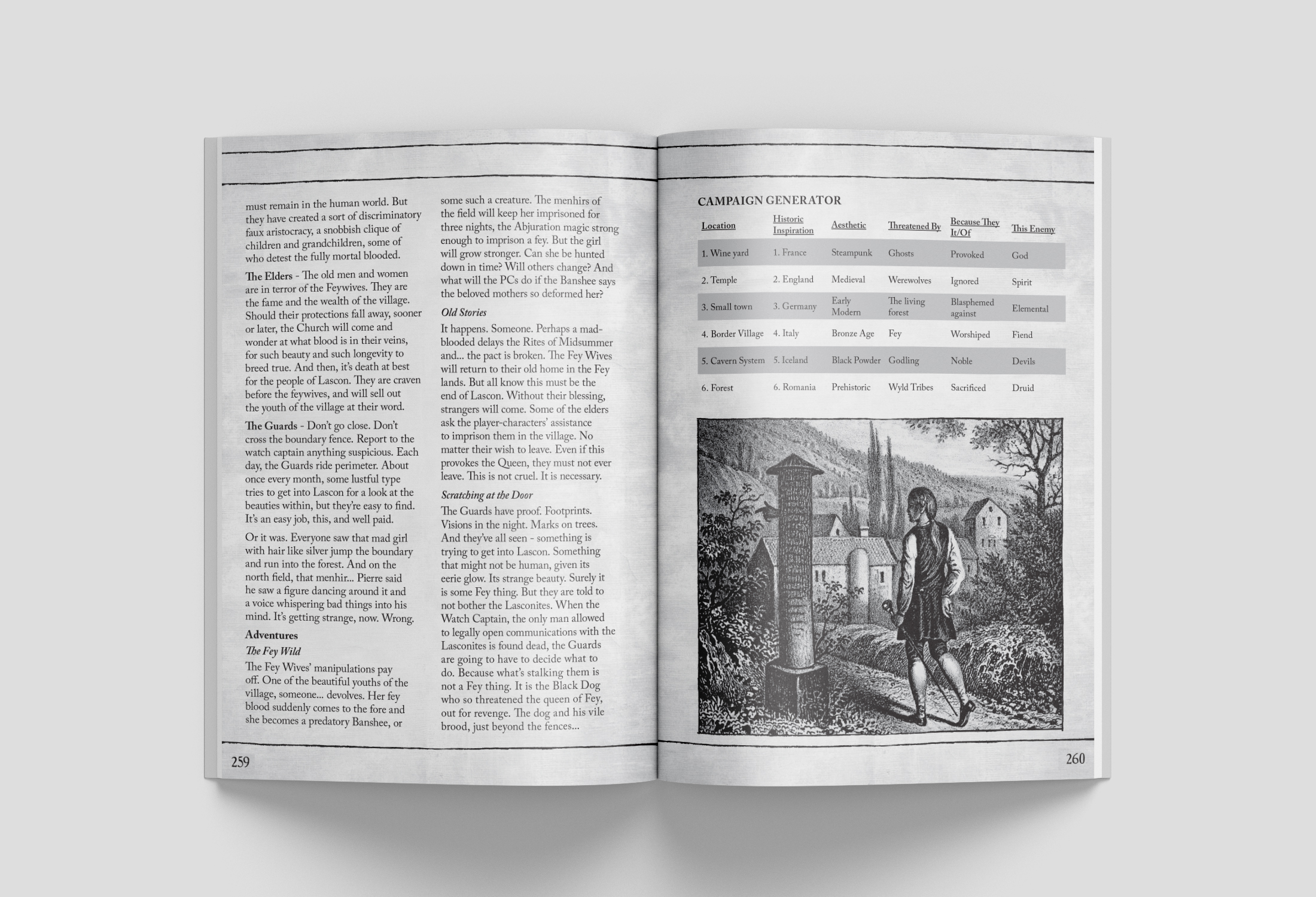 This book advises fantasy GMs on how to reskin D20 character classes and concepts for a Wickerpunk campaign. It advises concepts such as historical settings, fantastic locations, and how to reimagine well-worn monsters as dark things of the forest and moor. And it gives players the tools to confront the forces of darkness among the ancient runestones and shrines to forgotten saints and primal godlings of branch, bough and brook.